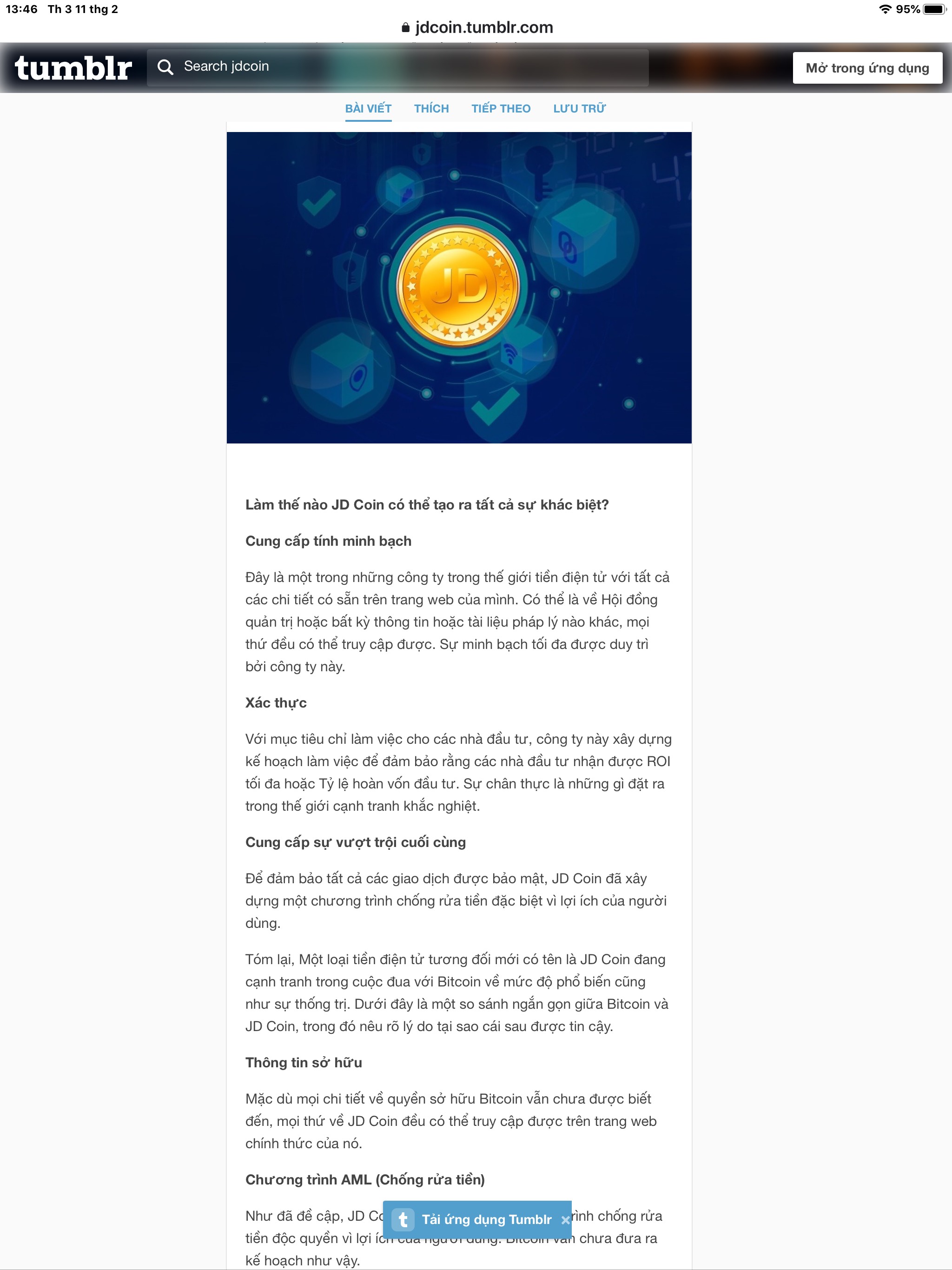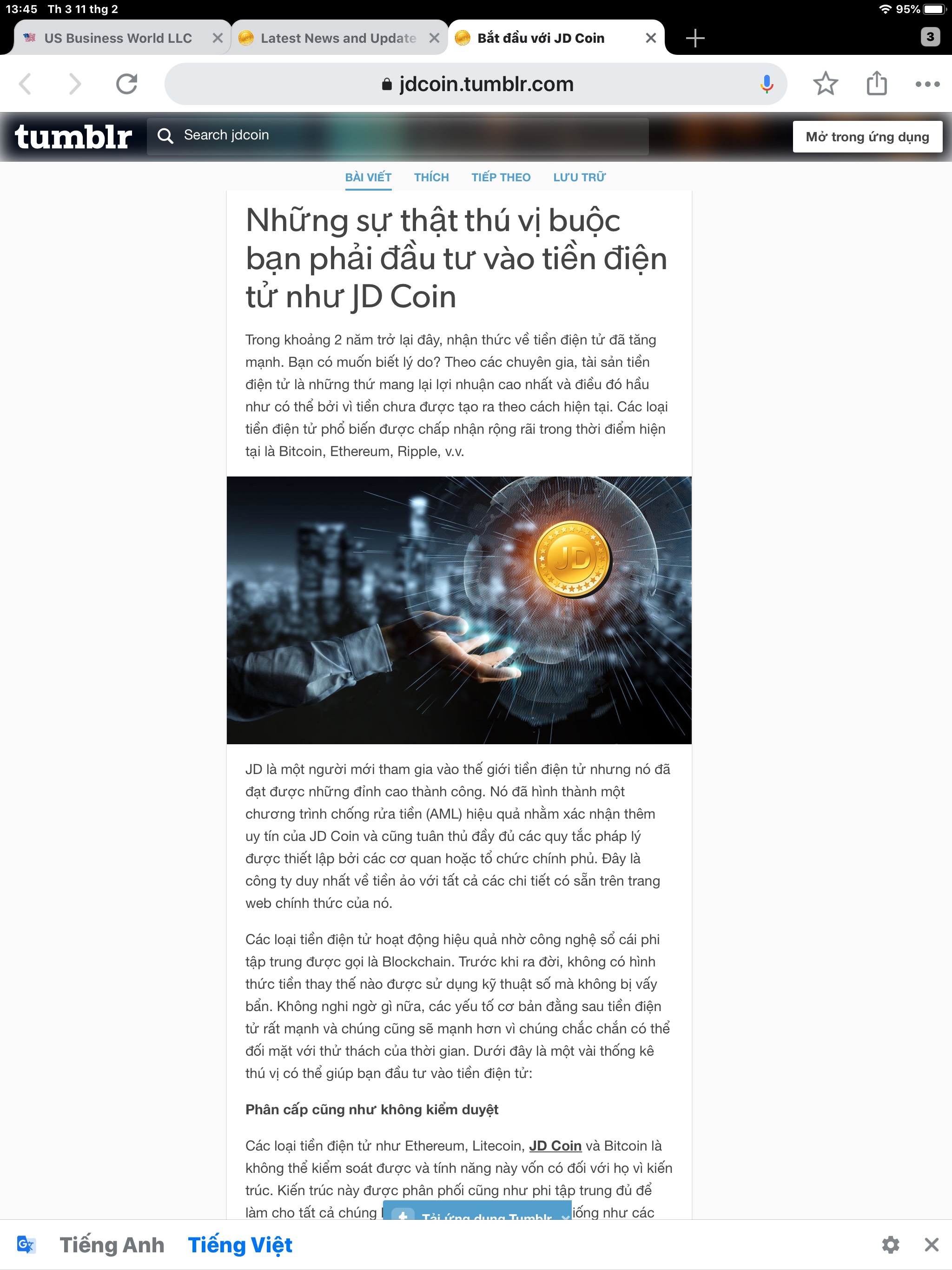 /-flag Bản Dịch, JD Coin là một liên doanh của Thế giới kinh doanh Hoa Kỳ từ Hoa Kỳ Nó là một loại tiền điện tử được cung cấp bởi công nghệ blockchain. Nó là đối tác của Bitcoin với việc cung cấp 84 triệu coin so với 21 triệu bitcoin. Nó được cấp phép đầy đủ ở Mỹ dưới dạng ngân hàng tiền điện tử và cũng được đăng ký theo Fincen (đơn vị thực thi tội phạm). Đã được chấp nhận ở Trung Quốc, Amazon.com và Agoda như một phương thức thanh toán Bạn có thể tìm thấy thông tin ở đây https://www.jdcoin.us https://www.usbwllc.com